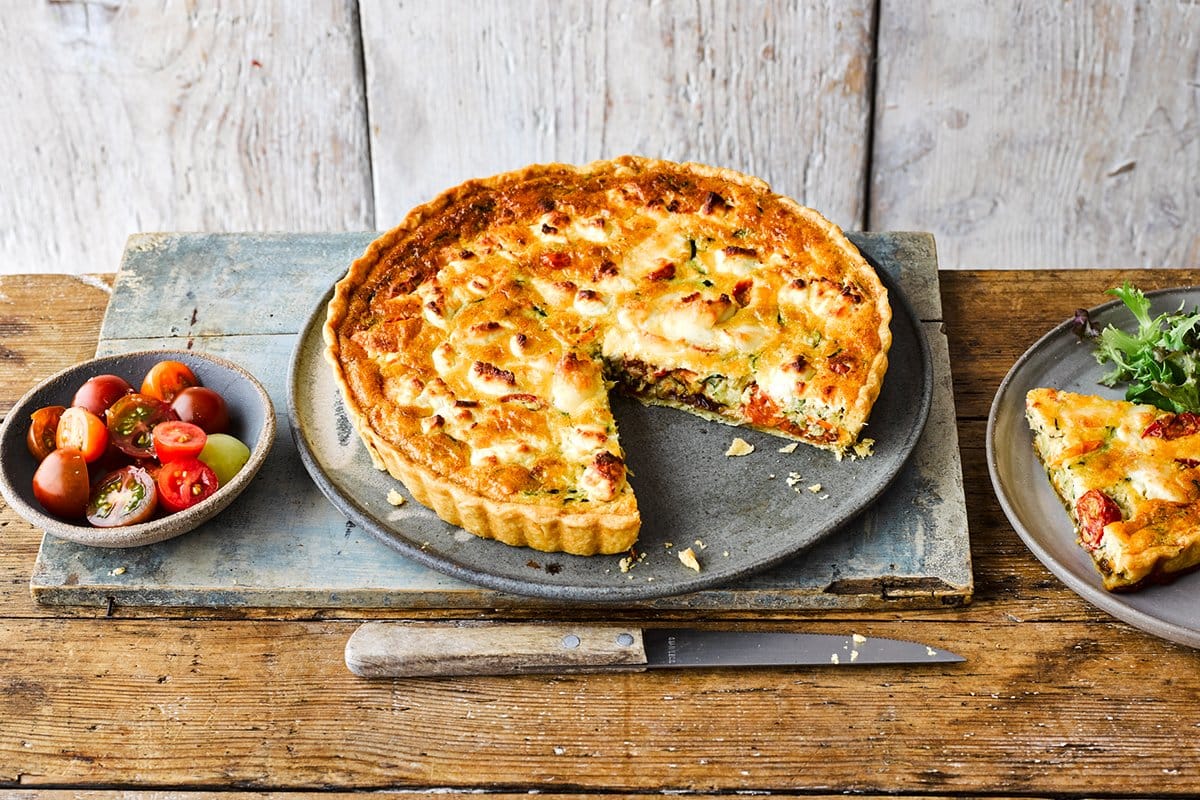 GOATS’ CHEESE, TOMATO AND COURGETTE TART WITH TRACKLEMENTS STICKY FIG RELISH