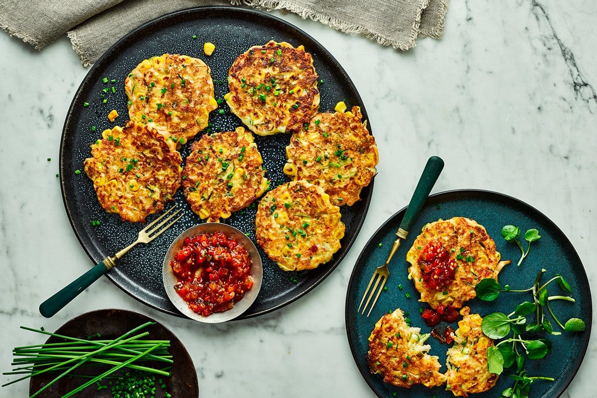 Sweetcorn and Halloumi Fritters with Tracklements Sweet Pepper Relish