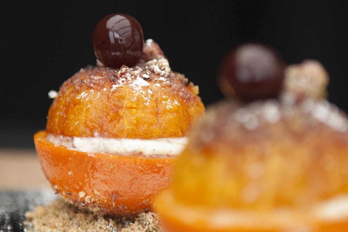 Poached clementines, with black cardamom cream and biscuit crumble…